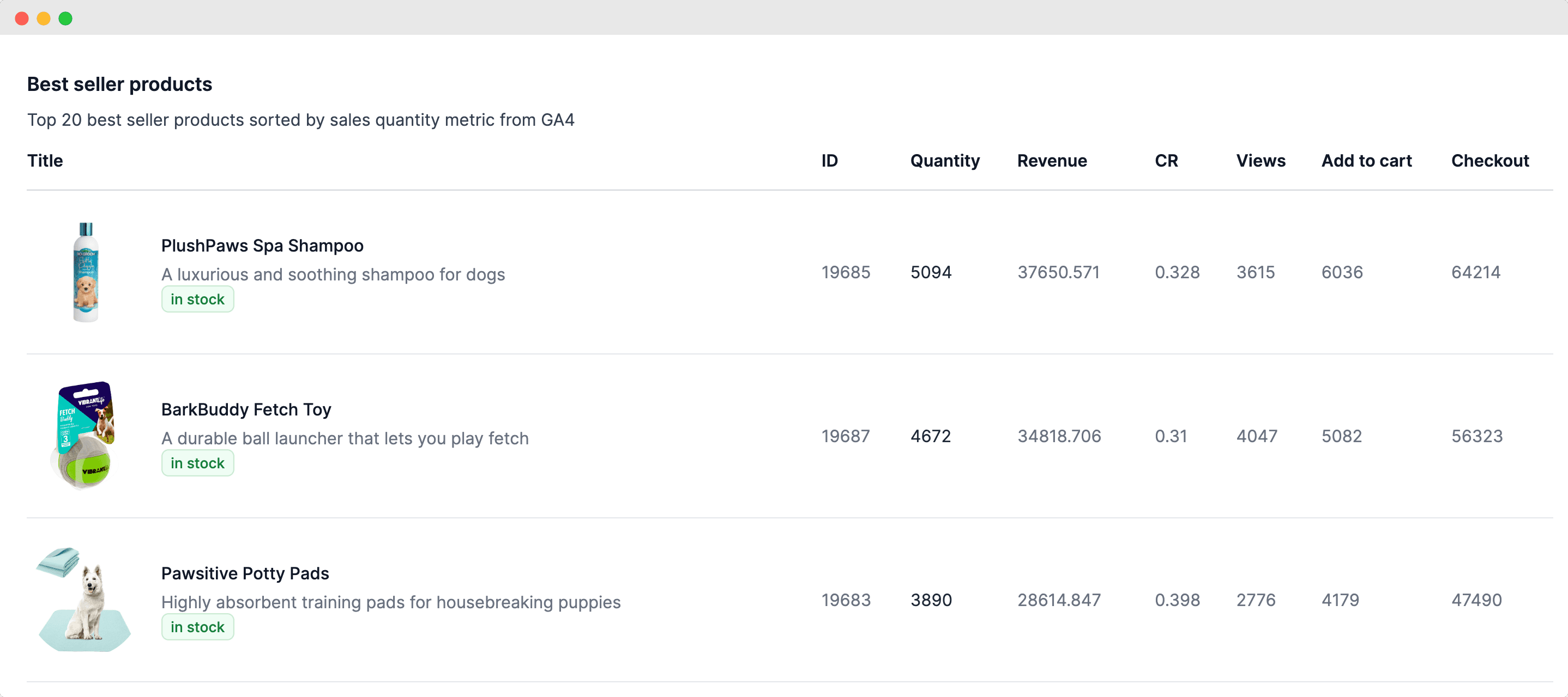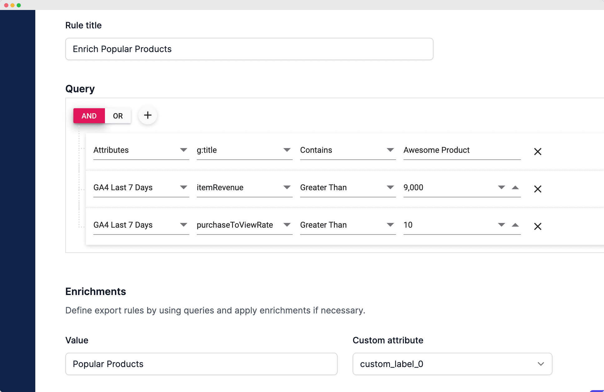 Apply filters on product attributes or their performance metrics fetched automatically from Google Analytics 4.