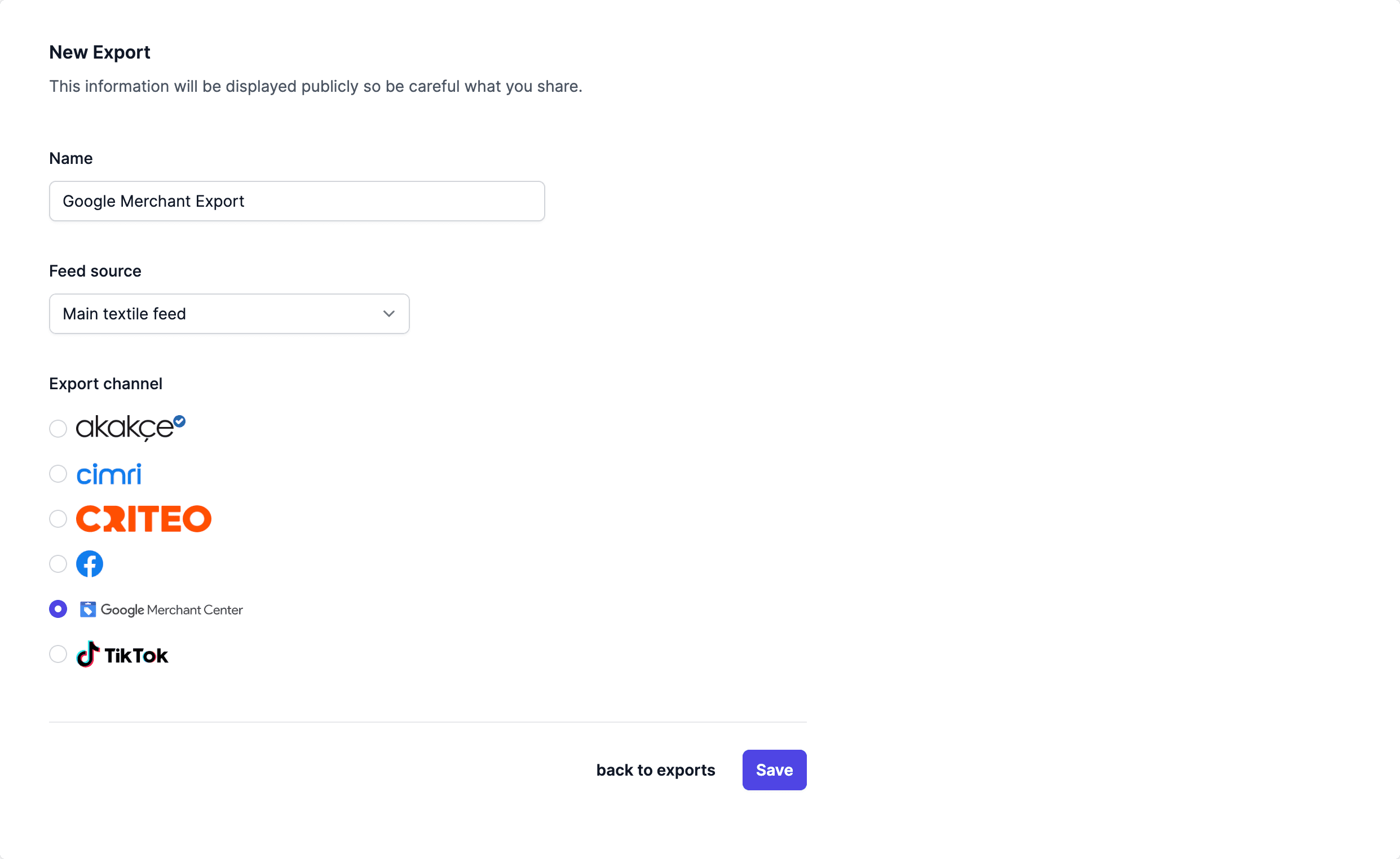 Meta Ads Catalog, Google Ads (Google Merchant Center), Criteo Product Feed, TikTok Product Feed, RTB House Product Feed, Yandex.Direct Product Feed, Insider, Segmentify, Akakce, Cimri and more to come.